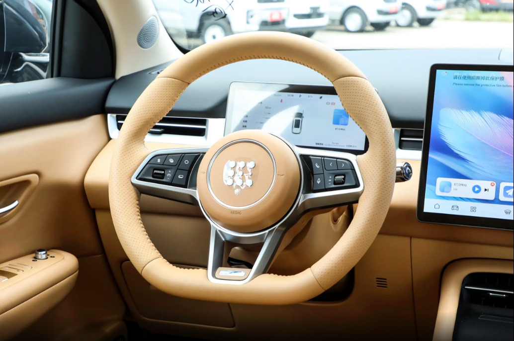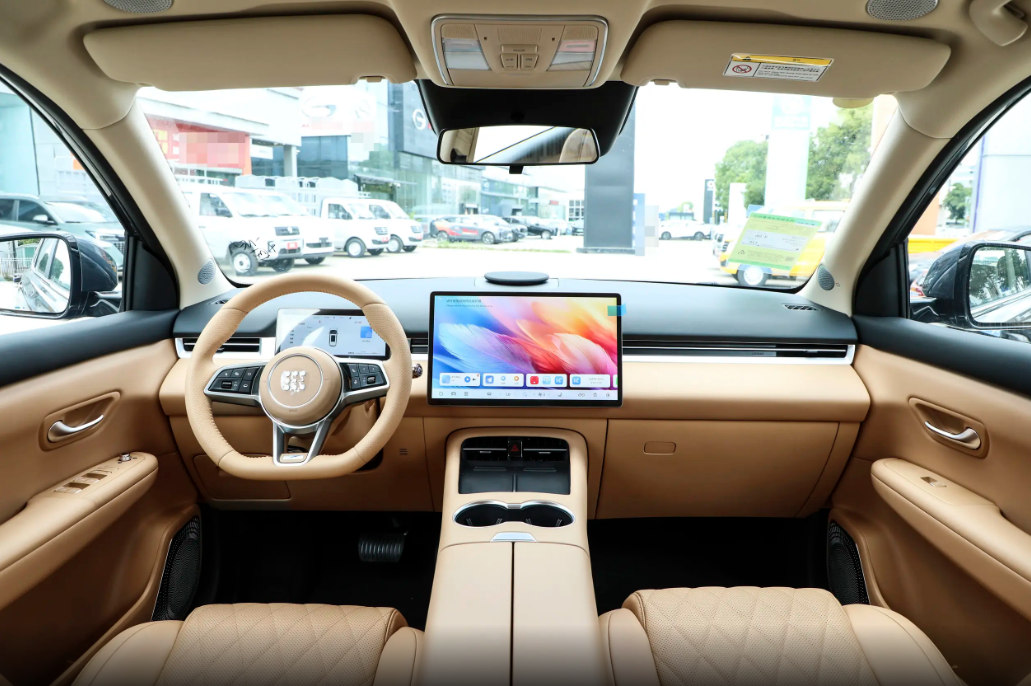 坐进蓝电E5 PLUS 先享版车里,这感觉就对了,它没搞那种所谓的科技风,而是用软乎乎的材料和偏暖色调的搭配,让你一坐进来就觉得挺放松的,像在自己家沙发上一样。尤其是胡桃棕的配色,看着挺显档次的,完全不像个十万块钱不到的车,方向盘加热这种越级功能也在高配车型上给配上了。车内配备全液晶仪表盘。可以显示丰富多样的信息,中控台15.6英寸的大屏确实挺抢眼,屏幕的显示效果和反应速度都还不错。中控台下方还给配了个50W的手机无线充电板,充电速度挺快的,基本上你开车通勤这段时间,就能给手机充不少电,算是个很实用的功能。